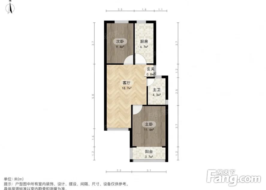 【此房户型】:产证面积65.8平,2房1厅1卫,厅南北正通,卧室朝南,客厅朝南,厨卫并排朝北全明。